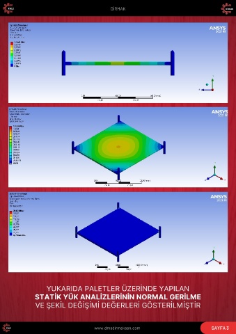 DİRMAK 2 YUKARIDA PALETLER ÜZERİNDE YAPILAN STATİK YÜK ANALİZLERİNİN NORMAL GERİLME VE ŞEKİL DEĞİŞİMİ DEĞERLERİ GÖSTERİLMİŞTİR www.dmsdirmaksan.com SAYFA 3